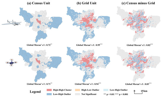 The global and local Moran’s index in the study area. The two rows correspond to two types of drones, generic and rotary wing. The three columns correspond to the census unit, the regular grid cell, and their bias.