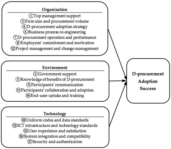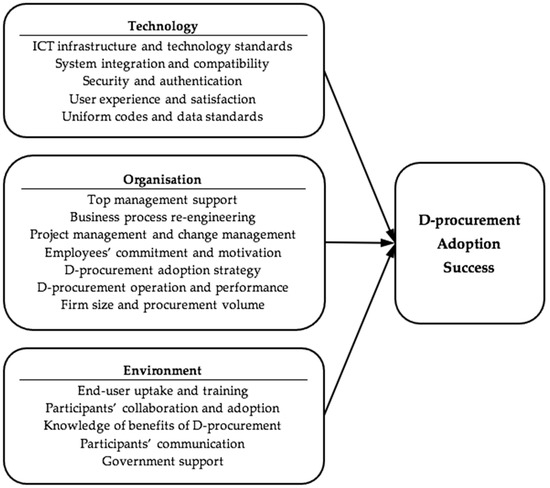 Second, the environmental factors should be included in the model. In the Chinese context, government regulations and support significantly impact business organisations and operations. Thus, it is absolutely important to consider the environmental factors when studying the CSFs for D-procurement adoption success. The environmental context is included in TOE, but not in the DOI theory [46].