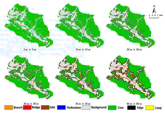 The current land use types in the study area were used as the basis and converted into pixel-size raster layers. According to the research needs, three types of natural elements, forest, grassland, and water, were extracted as foreground, and the remaining four types were used as background, which were then converted into TIFF format binary raster files and imported into Guido Toolbox 3.0 software for analysis. After MSPA analysis, the foreground was divided into seven categories of non-overlapping landscape structures: Core, Islet, Perforation, Edge, Loop, Bridge, and Branch. Considering that the study area is small, but there are many large patches, the study granularity is too large to reflect the details of the landscape, while the granularity is too small to fragment the results. The results of MSPA with six different landscape grain sizes from 5 m to 80 m were compared and analyzed, and the final landscape grain size used in the study was determined to be 20 m (Figure 2). 20 m × 20 m can meet the accuracy requirements of the study data and can better preserve the important ecological patches in the study area.