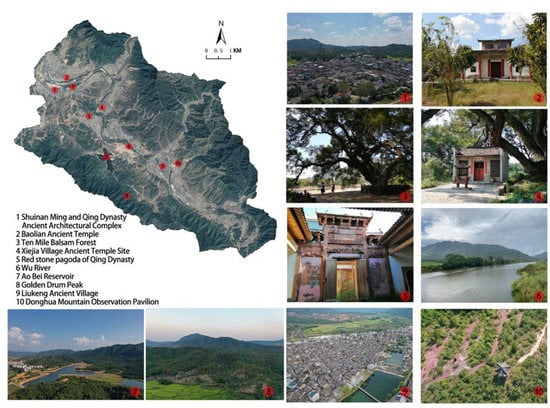 Liukeng Cultural and Ecological Tourism Zone is a cultural and ecological tourism coverage area delineated in the Tourism Development Master Plan of Le’an County, Jiangxi Province, with the ancient village of Liukeng as the core, expanding upstream and downstream along the Wu River, including many surrounding villages and mountains; the area is located in the eastern part of Le’an County, Fuzhou City (Figure 1a), 115°42′31″ E–115°49′5″ E, 27°14′5″ N–27°19′22″ N, with a total area of about 57.25 km2; the area belongs to the subtropical monsoon climate zone, with a mild and humid climate, sufficient rainfall and four distinct seasons; the terrain in the territory is high from north to south and low in the middle, with Wu Jiang River crossing the middle of the study area and flowing gently from southeast to northwest, with low mountains, hills, hillocks and small basins interspersed, with elevations of 81–551 m. The ecological quality of the ecological tourism area of Liukeng is excellent, with a woodland area of 36.8 km2, accounting for 64.43% of the total area (Figure 1b); biological resources are abundant, with a variety of wild animals such as hares and wild boars, as well as birds of prey such as turtledoves, egrets, and whiteheads [32]. At the same time, the region has a long history and culture. Not only the historical pattern of Liukeng Village is well preserved and rich in types of cultural relics and monuments, but also the ancient temple of Xiejia Village, the red stone pagoda of the Qing Dynasty, the Hidden Lotus Temple, and other human resources worth protecting.