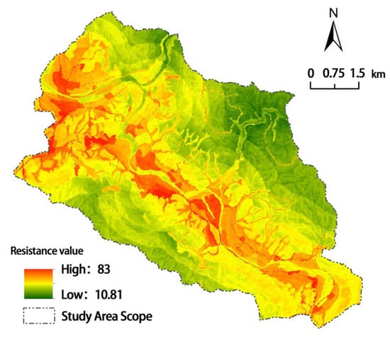 The comprehensive resistance surface of the landscape of the Liukeng tourism area is constructed based on six influence factors: elevation, slope, land type, distance from water bodies, distance from residential areas, and distance from roads. As can be seen from Figure 5, the resistance values in the study area range from 10.81 to 83. In terms of spatial distribution, areas of relatively low resistance are in the northeast and southwest sides of the study area, which are areas of extensive woodland distribution; The areas with high resistance values are in the northwestern and central valleys of the study area. Although the Wujiang River flows through these areas, these areas are widely distributed with settlements and cultivated land where residents and tourists are active, affecting the smooth flow of natural ecological processes and therefore have high resistance values.