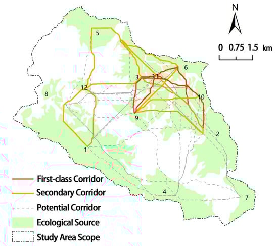 Based on the selected source patches and the landscape resistance surface formed by the overlay, the Cost Weighted and Cost Path tools in ArcGIS are used to generate the minimum cumulative cost surface for each ecological source site and the minimum cost path to other source patches, which can yield 66 potential landscape corridors. The relative importance of the landscape corridors was compared based on the gravity model calculating the interaction size between source patches (Table 4), while the importance of the landscape corridors was graded in relation to the actual conditions of the Liukeng tourism area and the location of the main natural elements and settlements. In this study, source site combinations with interaction sizes over four were selected, and the importance of the landscape corridors connecting them was set at level 1. Source site combinations with interaction sizes between 1 and 4 were connected by secondary landscape corridors, and other connections were considered potential corridors due to their low interaction strength. After sorting, ten important landscape corridors, 13 secondary ones, and the rest as potential corridors were obtained (Figure 6). These corridors together constitute the potential landscape corridor network system of the Liukeng Cultural and Ecological Tourism Zone.