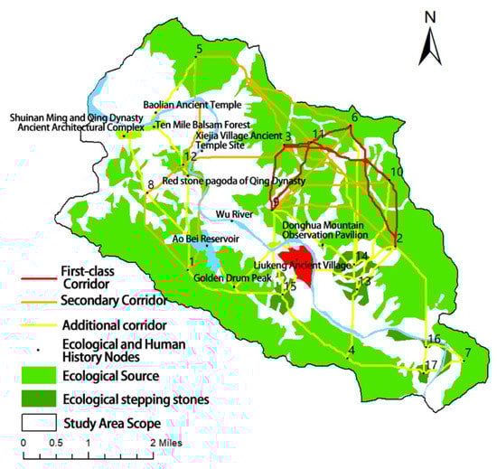 This paper selects objects different from the previous watersheds, urban centers and other large-scale hierarchies and studies the Liukeng cultural eco-tourism area from the mesoscale hierarchy, exploring how to protect the harmonious symbiotic relationship between rural humanities, history, and ecological environment in the context of increasing expansion of human activities in the spatial pattern. Based on the more mature MSPA and MCR models, we compare and analyze the landscape granularity suitable for mesoscale, construct a mesoscale landscape corridor network structure evaluation system in combination with the current situation of the case, and optimize the landscape corridor network using humanistic landscape corridors, restoration of ecological breaks, and addition of ecological steppingstones. The scientific identification of ecological sources, construction of multi-functional landscape corridors, strengthening of ecological and humanistic nodes, and formation of a reasonable network of multi-functional landscape corridors in the countryside. This way is expected to improve the overall ecological efficiency of the countryside, drive the development of regional tourism, protect the native culture, maintain the stability and sustainable development of the rural areas, and provide methodological references for the work related to rural ecological planning.