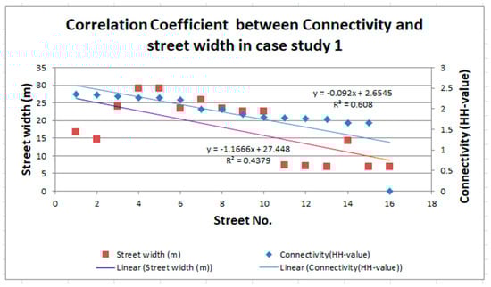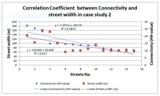 The next stage involved calculating the correlation coefficient between the street width and the HH value provided by Depth Map X (Table 4). The result displays a high positive correlation of (+0.703), demonstrating their strong association (Chart 3) and proving the transitive property mentioned earlier and leading to the second section.