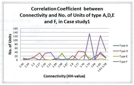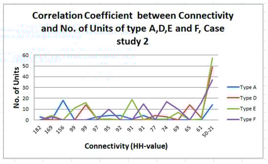 All negative correlation coefficient values less than 0.5 in Table 3 and the extreme fluctuations of the number of units per type calculated according to the street’s connectivity are shown in Chart 2. This indicates low or no correlation between the variables mentioned above. If we set the correlation value in order starting with (−0.471) for type A, (−0.358) for type F, (−0.291) for type E, and last (−0.218) for type D, they show chaos. There is no consideration whatsoever of street width in locating the residential plots according to their sizes, which highlights a total neglect of the Iraqi regulation [18] in addition to the theories of space syntax.