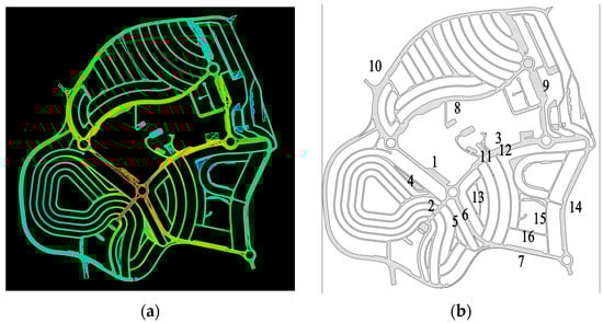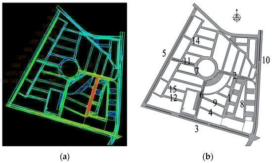 The axial map analysis determines the street with the highest HH-value, denoted by a red tone, grading down to orange, yellow, green, light blue, and dark blue (Figure 7a). The translations of the connectivity hierarchy of streets into numbers are shown in Figure 7b. Table 2 shows the resulting HH values from the connectivity analysis as the initial set of data input.