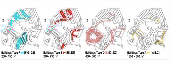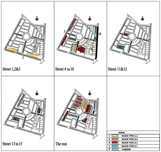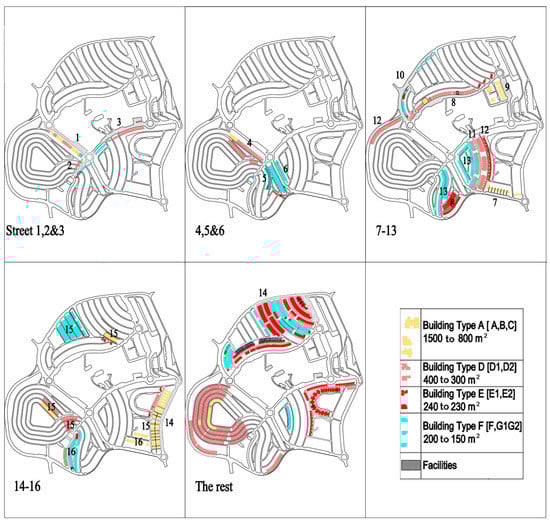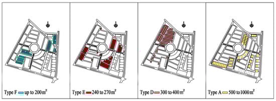 The second section’s first step is calculating the number of each type of residential plot (A, D, E, and F) categorized according to their size ranging from 1500 m2 to 150 m2 and per individual street starting from the most highly connected street to the whole spatial layout, as shown in Figure 5.