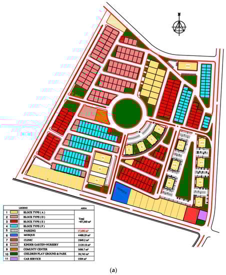 Another urban village in Sulaimanya city established in 2010 which also is considered one of the most extensive residential compounds in Iraq with world-class living [34], accommodating a total of 366 residential units from (14%) exclusive detached villas of 600 to 1000 m2 (Type A), (24%) detached villas of 300 to 400 m2 (Type D), (33%) semidetached houses of 240 to 270 m2 (Type E), and (30%) row houses of up to 200 m2 (Type F). The compound includes several facilities, as shown in Figure 6.