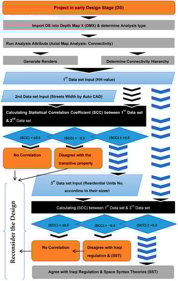 Depth Map X converts the places of any urban layout into a discrete accumulation of line segments that a software application can examine. Then, it runs algorithms within those streets using colour to determine the connections hierarchy of the layout in order to render it as visually readable as possible. The most intense red lines are the most physically connected to the whole system, while yellow, green, and blue show the less related individuals, respectively. In addition to the renders, the program presents each line with a value called the HH-value (Hillier and Hanson) that is utilized in this research as an initial set of data input. According to the hierarchy of connectivity, the width of each street is measured in Auto CAD and utilized as a second set of data. The correlation coefficient between the above-mentioned two sets of data is measured in Excel. In the second section of this research, the quantity of residential plots of different sizes (categorized by type) directly facing each street is counted according to the hierarchy of connectivity revealed by the result analysis and is used as a third set of data. In order to determine how closely related or associated the first and third sets of data are, a statistical correlation coefficient per type of plot is calculated. If the result is equal to or greater than (+0.5) it shows a positive correlation. If it is above (−0.5), that shows a negative correlation, and if it is less than (±0.5) it shows no correlation.