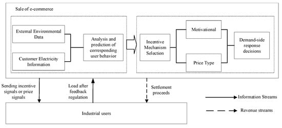 This paper uses demand-side response metrics to characterize the relationship between users, demand-side response volumes and costs. The external characteristics of industrial parks in various time periods and situations are modeled without analyzing the complex load composition inside users and building demand–response costs for various loads. Therefore, this model has the characteristics of high efficiency and clear characterization and reflects the allocation of demand-side resources. Through price incentives, a more efficient and flexible demand-side management can be established. The implementation framework of a demand–response strategy for industrial parks is shown in Figure 1.