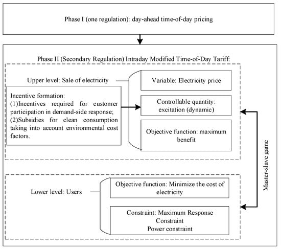 In the first stage, users adjust their electricity usage arrangements based on the day-ahead price information. The day-ahead tariff is corrected by controlling the intra-day incentive change. The second-stage objective function is built to maximize the revenue of electricity sellers and minimize the cost of electricity for customers. Price incentive constraints and park load characteristic constraints are set, and variable intra-day electricity sales prices are solved to achieve dynamic pricing. The process is illustrated in Figure 3.