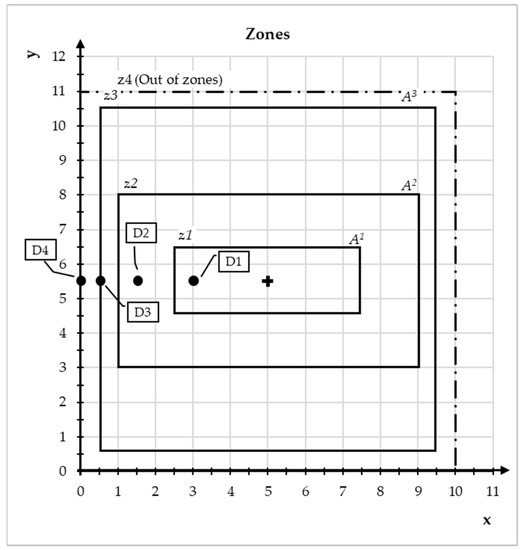 We assume the regulatory measures divide the city area into three different zones, denoted by z1, z2, and z3, respectively (Figure 1 and Table 1) [38]. Additionally, we consider zone z4 (out of zones) a suburban area where the depot point to supply the city can be placed. We presume the zones are nested with the same center and with the areas of .