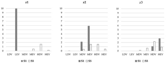 As mentioned, different vehicles are permitted to operate in different zones: light DVs and EVs in zone z1; light and medium DVs and EVs in zone z2; and all types and sizes in zone z3. In all scenarios, in the final year of the planning time horizon, all DVs are replaced by EVs. Hence, the energy cost becomes the dominant factor in the TC, as EVs have lower energy costs than DVs, reinforcing the findings of Lebeau et al. [18]. Moreover, reflecting the regulatory measures, in all scenarios except S5, at the end of the planning time horizon, the fleet in zone z1 ended up with LEVs, z2 with MEVs, and z3 with HEVs. As already verified, in scenario S5, the lack of regulatory measures allowed for an increase in the size of the vehicles in all zones, thus reflecting economies of scale in the fleet.
