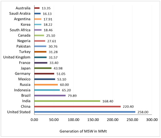 Plastic products, including those of PET, are often dumped after use and generally form part of MSW. MSW is often a rich source of numerous kinds of recyclable materials such as plastic, paper, glass, and metal. This practice is still in vogue across continents such as the EU, Australia, the USA, India, etc. The general composition of MSW generated in the USA in 2013 is presented in Table 1 [20], which indicates that plastic waste, including PET waste, comprises about 13% of the MSW. Data from a report published by the EPA [21] show that plastic containers and packaging discarding are the primary sources of PET waste in MSW in the USA. Figure 6 shows the MSW generated from some prominent countries [22].