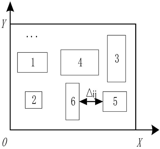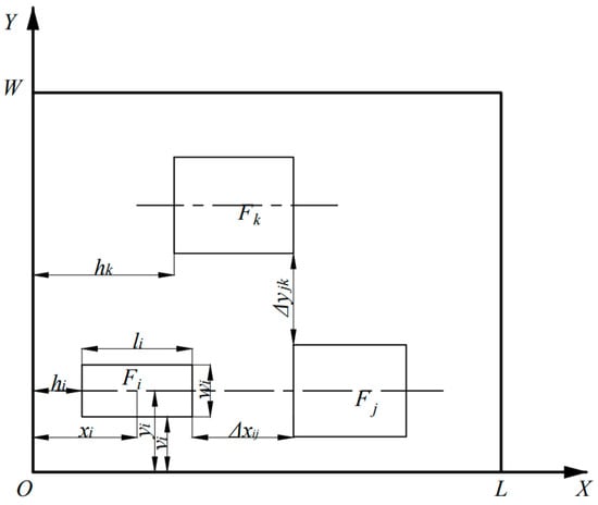 Based on the above assumptions and in consideration of improved clarity in description, a coordinate system is established with the bottom-left corner as the origin. This system serves as a reference for calculating the centroid position of the workshop. The X-axis and Y-axis represent the length and width directions, respectively, of the workshop under consideration. The schematic diagram of the workshop layout is illustrated in Figure 1. Accordingly, the constraints can be easily constructed as presented in this section.