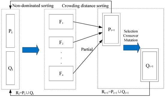 The standard NSGA-II algorithm’s elitist retention strategy involves preserving all high-quality individuals and filling them into the next generation parent population. However, this may lead to rapid convergence or getting stuck in a local optimum, reducing population diversity. To maintain diversity, a distribution function is introduced to limit the number of elites in the parent population. This involves selecting some non-elite solutions by including only a portion of the individuals from the non-dominated front into the next generation. The improved elite selection strategy is shown in Figure 4.