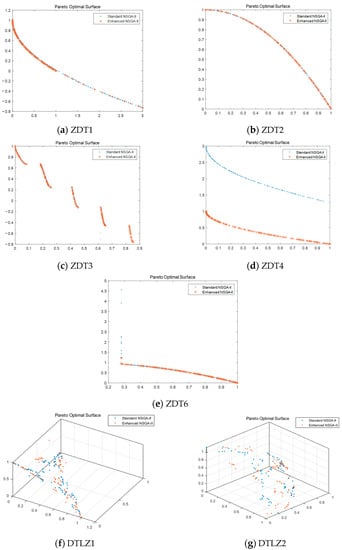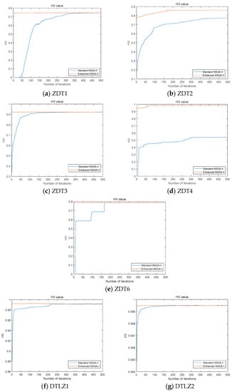 Various DTLZ series functions (DTLZ1, DTLZ2) and ZDT series functions (ZDT1, ZDT2, ZDT3, ZDT4, and ZDT6) were chosen for tests in this study, and the findings are compared to those from the standard NSGA-II test. The running results for HV metrics are obtained by running separately for 30 times with a population size of 100 and 500 iterations. The results are displayed in Table 5. The Pareto front surface of the two algorithms on the test function is shown in Figure 5. The graph of the objective function’s evolution over time with the number of iterations is shown in Figure 6. As shown in Table 5, the enhanced NSGA-II algorithm has superior convergence and distribution compared to the original NSGA-II method.