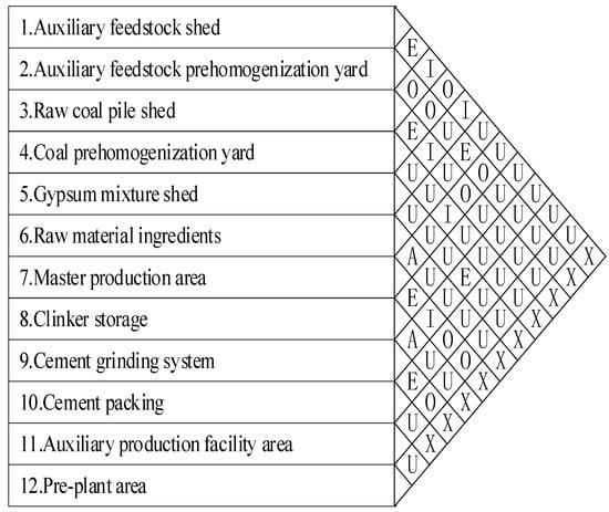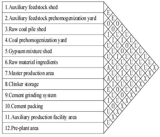 When it comes to workshop layout in cement plants, the influence of logistics relationships is significantly greater than that of non-logistics relationships. Adhering to a weighted ratio of , utilizing the assigned values for different levels, the composite relationship level value is determined and a comprehensive interrelationship diagram is depicted as shown in Figure 9.