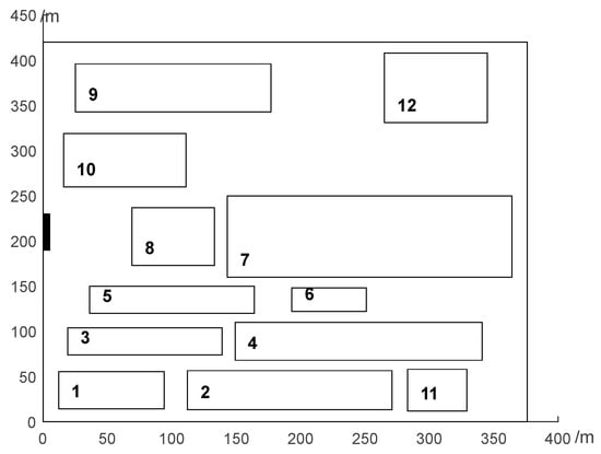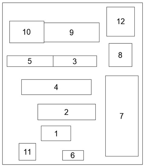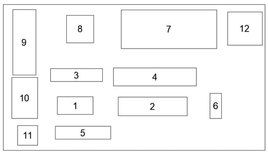 In summary, the initial layout plan obtained using the SLP method is shown in Figure 10, while the original factory layout plan is shown in Figure 11. The numbers in Figure 10 and Figure 11 represent the 12 workshops in the case, and the workshop names and sizes correspond to the numbers in Table 6. To obtain more reasonable layout results, both initial solutions are reverse-encoded and added to the initial population.