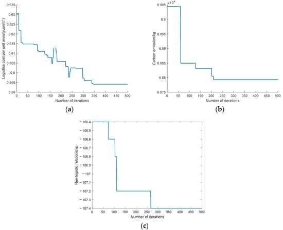 Population evolution iteration diagram. (a) Iterative curve of logistics cost per unit area. (b) Iteration curve of carbon emissions. (c) Iterative curves for non-logistic relationships.