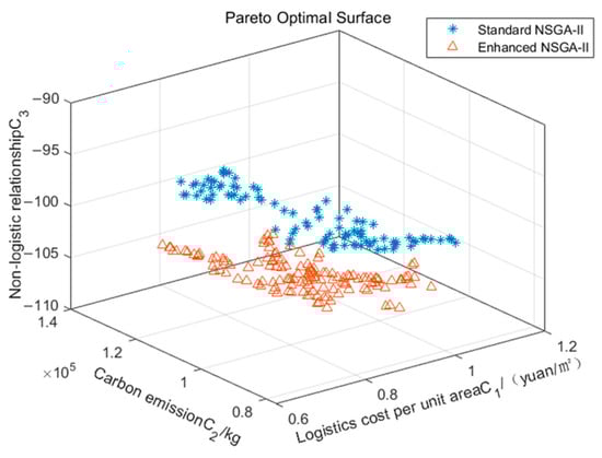 Moreover, to demonstrate the effectiveness of the enhanced NSGA-II algorithm, a Pareto frontier comparison chart is plotted in Figure 14. The results show that the enhanced algorithm can obtain a better set of solutions compared to the standard algorithm, with better performance on all three objectives. Therefore, the proposed algorithm can achieve good results in solving multi-objective workshop layout problems.