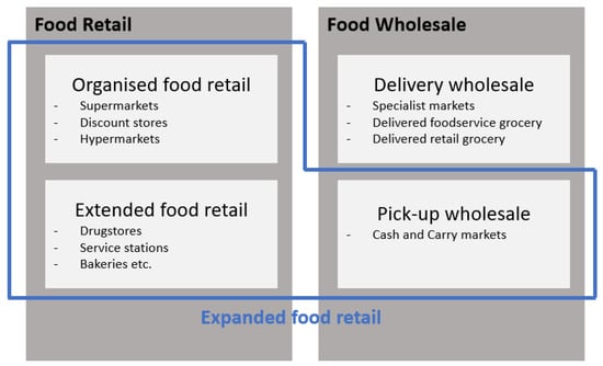 The retail sector can be divided into different types of businesses with different priorities in their product range (Figure 1): organised retail (supermarkets, discount stores, and hypermarkets) and extended food retail (drugstores, service stations, bakeries, butchers, online retailers, beverage stores, sales stands, and “other” outlets such as kiosks and specialty stores).