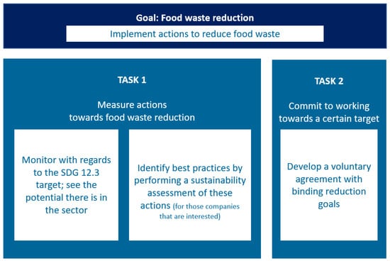 In support of the companies implementing their own actions to reduce food waste, the Discussion Forum had two main tasks (Figure 2), all contributing to the overarching goal of FW reduction. Firstly, it aimed at assessing the status of FW reduction. To do so, it included monitoring FW for the participating companies in the retail and wholesale sectors, allowing them to see where they stand regarding the SDG 12.3 target. Furthermore, a sustainability assessment of specific actions was provided in order to determine best practises and efficient actions. Secondly, the Discussion Forum stressed liabilities, as there is a political demand for binding reduction goals (set within the Coalition Agreements from 2018 and 2022 [,]). The liabilities were implemented as a VA and signed by relevant companies from the retail and wholesale sectors and the responsible ministry (the Federal Ministry of Food and Agriculture). Both tasks are described in detail in Section 3 (Measure action towards FW reduction) and Section 4 (Commit to working towards a certain target).