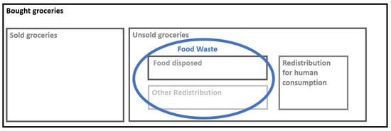 The Waste and Resources Action Programme (WRAP) published an overview specifically for the food retail and wholesale sectors []. They divided the methods into two different practises: product-based (before disposal) and waste-based (after disposal). Within the Discussion Forum, a product-based approach is used, and FW is defined as the total of unsold groceries excluding surplus food donated to charities, food banks, etc. and redistributed for human consumption (see Figure 3). For data collection, processing, and analysis, see Supplementary Information.