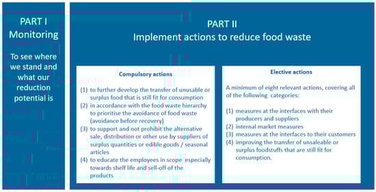 Secondly, the VA includes compulsory measures as well as elective measures to reduce FW. The compulsory reduction measures include (1) to further develop the transfer of unsaleable or surplus food that is still fit for consumption: (2) in accordance with the FW hierarchy, to prioritise the avoidance of FW (avoidance before recovery); (3) to support and not prohibit the alternative sale, distribution, or other use by suppliers of surplus quantities of edible goods/seasonal articles; and (4) to educate the employees, especially towards shelf life and, for example, reducing prices for products near expiry dates.