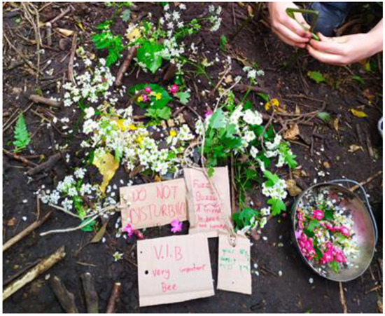 Arts-in-nature sessions were carefully planned to allow for child-led activities; this meant that there was flexibility to follow the interests of the children piqued by changes in what became familiar outdoor spaces over the course of the project. For example, in one session, children found a dead bee and spontaneously proceeded with organising a funeral and memorial. During the funeral, many children pretended to cry to express their bereavement and created a ‘grave’ for the bee writing ‘Rest In Peace’, ‘VIB-Very Important Bee’, and ‘Fuzzy Buzzy–A friend to bees and humans’ (Figure 6). One artist reflected that as they were creating the memorial “I heard a chanting behind me: ‘More flowers, more respect’”. When children returned to the class, they searched on the internet to find more information about bees in their own time. One artist reflected:
