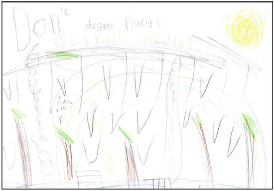 Although this did not frequently transfer into children’s drawings, there were a small number who explicitly referenced protection of the environment and nature often through words, such as “Don’t destroy nature” (Figure 7).