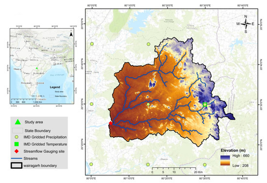 The present research was performed in the Pranhita subbasin of the Godavari River basin in the Indian state of Maharashtra. The research region has a total drainage area of 2600 km2 and is located between the longitudes 80°5′ E–80°40′ E and latitudes 20°20′ N–20°47′ N in Maharashtra and a small area in Chhattisgarh. According to the digital elevation models (DEM) produced by the Shuttle Radar Topography Mission (SRTM), the elevation of the research region varies from its highest point, which is 660 m, to its lowest position, which is 208 m. Figure 1 shows the map of the research region, along with the IMD gridded stations, the Wairagarh Streamflow station, the stream network, and the DEM. The average annual rainfall in the study area is 1421 mm, while temperatures range from 20.75 °C to 33.33 °C. Geology in the study area is dominated by Dongargarh Granite and little traces of Wairagarh metasediments [47]. This study area comprises 76.01% deciduous broadleaf forest, 22.72% cropland, and less than 1% shrubland and mixed forest [48]. Since the city of Gadchiroli is located downstream of this research region, accurate streamflow modeling of this study area will assist in managing water resources and developing policies to reduce the risk of flooding.