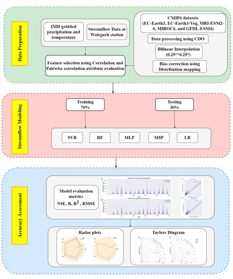 Accurate streamflow modeling is crucial for effective water resource management. This study used five machine learning models (support vector regressor (SVR), random forest (RF), M5-pruned model (M5P), multilayer perceptron (MLP), and linear regression (LR)) to simulate one-day-ahead streamflow in the Pranhita subbasin (Godavari basin), India, from 1993 to 2014. Input parameters were selected using correlation and pairwise correlation attribution evaluation methods, incorporating a two-day lag of streamflow, maximum and minimum temperatures, and various precipitation datasets (including Indian Meteorological Department (IMD), EC-Earth3, EC-Earth3-Veg, MIROC6, MRI-ESM2-0, and GFDL-ESM4). Bias-corrected Coupled Model Intercomparison Project Phase 6 (CMIP6) datasets were utilized in the modeling process. Model performance was evaluated using Pearson correlation (R), Nash–Sutcliffe efficiency (NSE), root mean square error (RMSE), and coefficient of determination (R2). IMD outperformed all CMIP6 datasets in streamflow modeling, while RF demonstrated the best performance among the developed models for both CMIP6 and IMD datasets. During the training phase, RF exhibited NSE, R, R2, and RMSE values of 0.95, 0.979, 0.937, and 30.805 m3/s, respectively, using IMD gridded precipitation as input. In the testing phase, the corresponding values were 0.681, 0.91, 0.828, and 41.237 m3/s. The results highlight the significance of advanced machine learning models in streamflow modeling applications, providing valuable insights for water resource management and decision making.