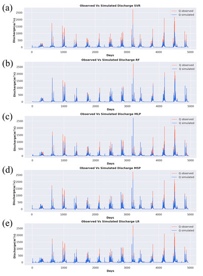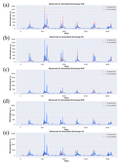 Line plot for observed vs. simulated streamflow for (a) SVR, (b) RF, (c) MLP, (d) M5P, and (e) LR during testing.