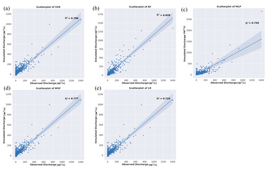 Scatter plot for observed vs. simulated streamflow for (a) SVR, (b) RF, (c) MLP, (d) M5P, and (e) LR during testing.