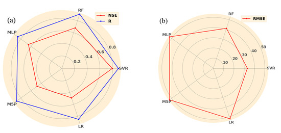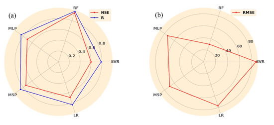 Figure 7 and Figure 8 represent the radar chart during training and testing using IMD gridded precipitation as input data. In Figure 7a and Figure 8a, both NSE and R are mapped; in Figure 7b and Figure 8b, RMSE is plotted in a radar chart. Figure 7a clearly demonstrates RF performing best, with a maximum value of NSE and R compared to other models. Figure 7b shows that a minimum RMSE was observed in the RF model, with a value of 30.805 m3/s. Similarly, during testing, Figure 8a,b exhibit both RF and SVR performing better in terms of NSE, R, and RMSE. RMSE is 41.237 m3/s in RF and 33.027 m3/s in SVR in testing.