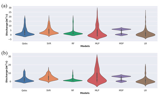 The violin plots seen in Figure 9a,b were designed for both training and testing using IMD gridded precipitation as input. For each model, violin plots were created for the interquartile range that was less than 95%, with the higher extreme flow values left out. RF was the best model in which the simulated streamflow displayed flow behavior that was more similar to the flow data of the actual streamflow than the other four models.