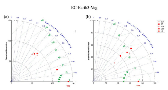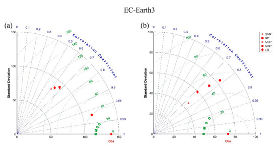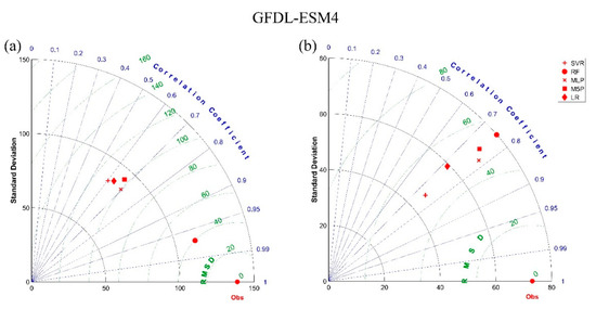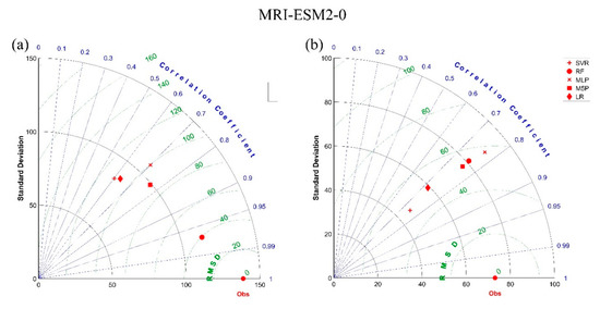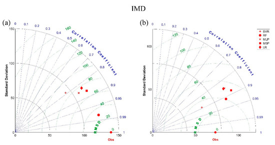Figure 10, Figure 11, Figure 12, Figure 13, Figure 14 and Figure 15 represent the Taylor diagrams of all five models using different precipitation datasets, i.e., EC-Earth3, EC-Earth3-Veg, GFDL-ESM4, IMD, MIROC6, and MRI-ESM2-0. It is abundantly evident in the Taylor diagrams that the results mentioned before are validated. The training and testing results indicate that RF is the model that performs the best in all scenarios. IMD is the best-performing precipitation dataset compared to the other CMIP6 datasets, making it the ideal choice for modeling streamflow.