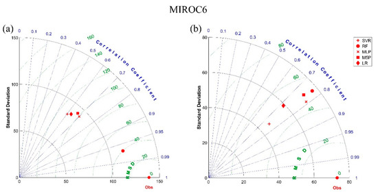 NSE, R, R2, and RMSE for SVR, RF, MLP, M5P, and LR models using MIROC6 dataset.
