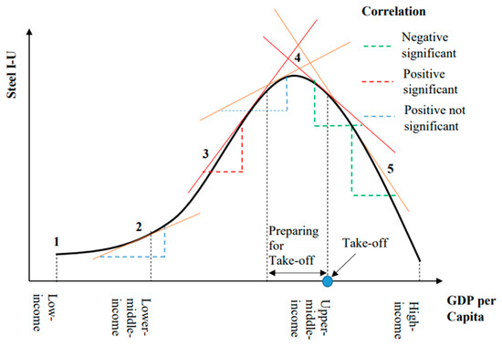 Our revealed steel intensity curve (Figure 4) is different from the common knowledge of previous research findings, as shown in Figure 1. Before take-off (in the previous study, it is the leveling off), there are three stages of transition from low-income to lower-middle-income (with a not significant correlation), lower-middle-income to upper-middle-income (with positive significant correlation), to take-off (with positive not significant correlation or negative significant correlation). From the take-off to a high-income country, the decline of I-U is immediately toward a negative significant correlation between I-U and GDP per Capita.