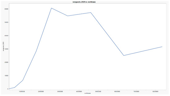 Correlations were calculated for every pair of variables in both datasets. Data analysis was made to test the significance of these relationships. We wanted to study if there was a relationship between worldwide COVID-19 infections and the arrival of new guests at lodging services in 2020 and if that would be negative. However, the results do not corroborate this idea. In the first half of the pandemic, we can observe that this relationship was linear and positive, after which it became irregular, as shown in Figure 1 and Figure 2.
