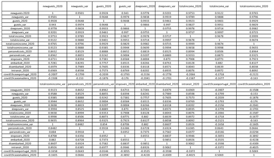 Analyzing the significance of the variables’ “New guests”, “Guests”, “Sleepovers” and “Average Stay” correlation with “COVID-19 cases in Madeira”, the results might appear counterintuitive at first since they are positively correlated. However, one can consider these values to reflect the region’s governmental policies. Such policies include testing the travelers arriving in ARM and the mandatory hotel quarantine until they receive their test results. Thus, these policies can explain why an increase in cases leads to more people being lodged in tourism accommodation services and consequently explain the correlation and significance level between the variables.