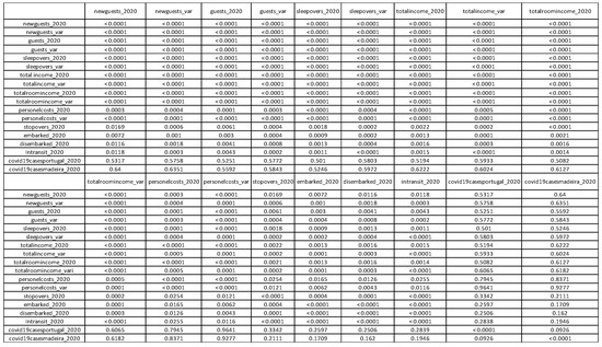 Focusing on municipal data, the correlation matrix of the municipalities represented in Figure 5 shows that the variable “COVID-19 cases in Madeira” has a combination of positive and negative relationships with the remaining variables related to tourism, represented in Figure 5, some of which have statistical significance, according to the results obtained in the p-value matrix in Figure 6.