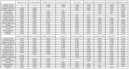 Firstly, a significance level of α was set at α = 0.05 to evaluate the statistical significance of the correlation between registered COVID-19 cases in the region and the tourism variables. Highlighted in Figures 4 and 6 are the p-values of such correlations, referring to the Monthly Report and the Municipality Report, respectively. Also highlighted in red are the results whose p-value is smaller than the significance level α. This means there is sufficient evidence to conclude that there is a significant linear relationship between those variables and the count of infections due to the correlation coefficient being significantly different from zero. If a slightly less usual significance level of α = 0.1 were to be assumed, variables “Longevity” and “COVID-19 cases in Madeira” would also become significantly correlated, which is an interesting result since older age groups, and in particular rural populations, tend to overlook and neglect these sorts of health crises, possibly explaining this result. However, keeping the current α, this correlation remains statistically insignificant.