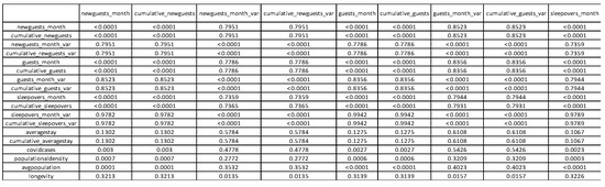 The correlation matrix for monthly data (Figure 3) shows that most of the correlations that made sense to investigate seem to have counterintuitive values and are not objectively what was expected. Additionally, by analyzing the values obtained in the p-value matrix (Figure 4), the results show that, when looking at the confirmed cases in the region, there is a pattern of negative correlations with most of the remaining variables. These results point towards the negative relationship that was expected. However, the p-value analysis of these correlations has revealed no statistical significance in the correlations between COVID-19 cases and the tourism indicators from 2020, so the results do not validate the significance of the negative relationship found and are thus not in line with the results obtained by [13,14,15,16], where this relationship was found to be positive.