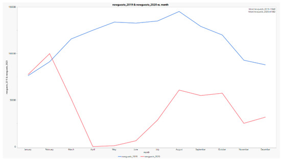 The results obtained allow us to draw important conclusions regarding what was proposed in the research questions. They showed that the correlation between the same variables was significant when compared among municipalities. However, that did not happen when analyzed by month. This is observable in Figure 7, which compares the two subsets of data from 2019 to 2020 (before and during the pandemic, respectively) as a portrait of the pandemic’s impact on the arrival of new guests in the region (see Figure 7).