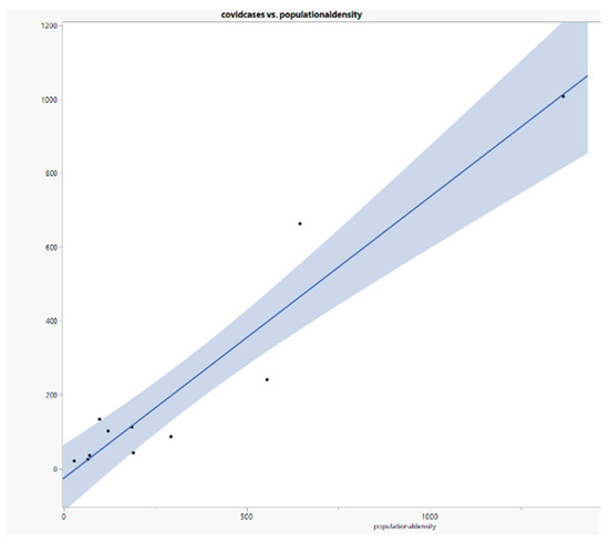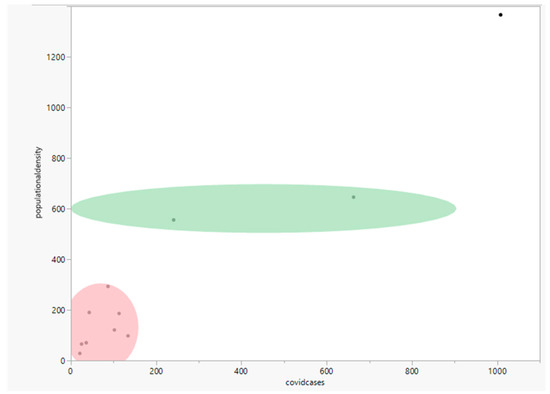 Furthermore, the data preparation phase provided a priori insight regarding population density. Some municipalities, such as Câmara de Lobos, one with a high population density, were highly impacted by the pandemic compared with most other municipalities. The results show that the variables “population density” and “average population” have shown a significant correlation with the variable “COVID cases”, as seen and highlighted in Figure 8, leaning towards the existence of a statistically significant linear relationship between each of the two variables and the variation in COVID cases.