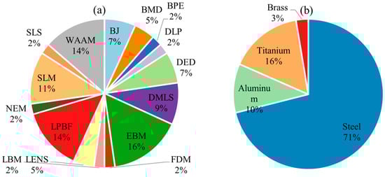 Based on the conducted literature review, various AM technologies were studied for different material types. Figure 3 illustrates the percentages of studies classification according to the adopted AM technology and material type, respectively. Based on the figure, we can see that the top two technologies that the literature handles are EBM, LPBF, and WAAM. Regarding the material aspect, most of the studies have been conducted on steel and steel alloy metals.