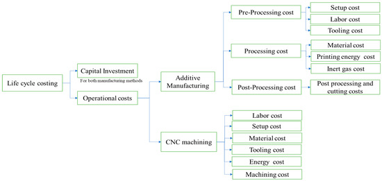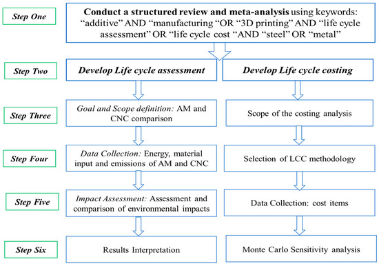 This paper follows the LCA approach to quantify environmental impacts and the LCC approach to investigate the economic performance of both manufacturing methods: additive and subtractive. Figure 4 represents the flow of research methodology adopted in this paper in a step-by-step manner.