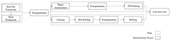 System boundaries are the borders between what is and what is not taken into consideration in an LCA study. The system boundary of this study is cradle to factory gate which is shown in Figure 5. Processes including raw material extraction, material processing, material transportation, and product manufacturing will be taken into consideration in the presented study. The environmental impacts associated with the use and end-of-life stages of the parts are not included in the scope of the study. As shown in Figure 5, in the first stage, raw materials and natural resources will be extracted from nature and then iron ore, coal, and limestone will be processed to produce a steel ingot. This steel ingot will be transported and processed via two paths depending on the manufacturing method. In the AM track, the steel ingot will go through a Water Atomization process in order to produce the metal powder which will be explained in the following subsection. After that, the powder will be transported to the factory or workshop where it will be utilized to 3D print the required parts. Meanwhile, in the CNC track, the steel ingot will be exposed to casting, hot rolling (which improves the material properties of the ingots and brings them closer to the desired shape), and finally milling through a computerized numerically controlled (CNC) machine to obtain the desired geometry of the parts. For the efficiency of casting and hot rolling processes, 10% and 5% material loss were assumed for casting and hot rolling processes respectively [28].